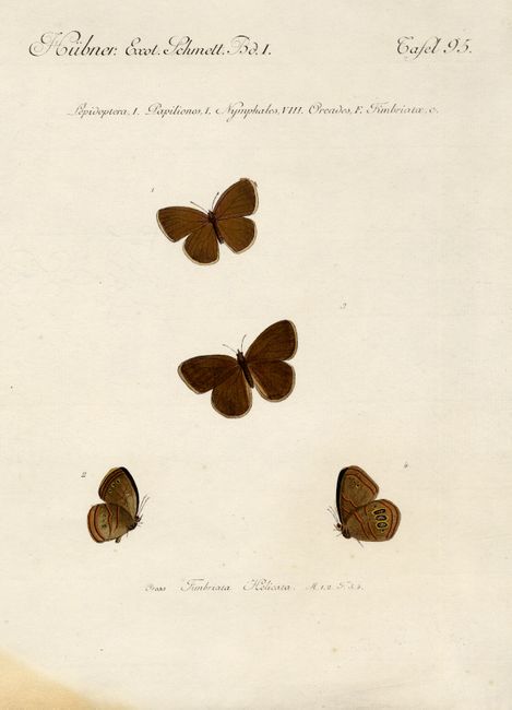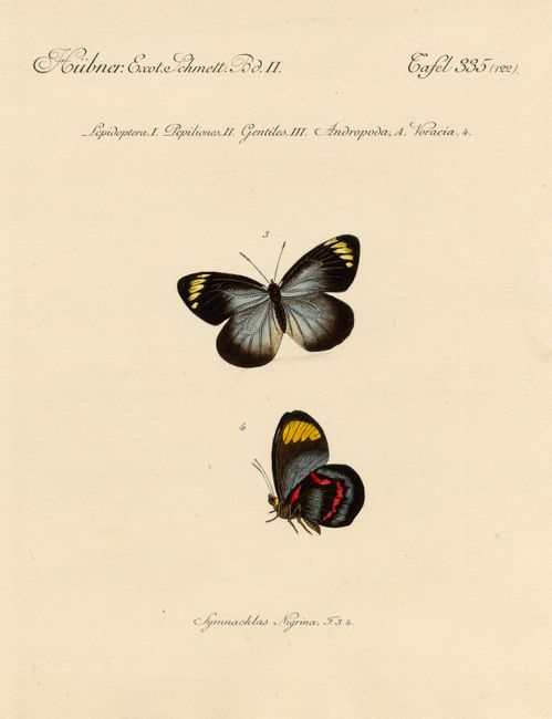 Ten lovely plates from this seminal work on entomology. Each is a finely rendered copper engraving and hand colored. Hubner was one of the first specialists to work on butterflies and moths and identified many new species.