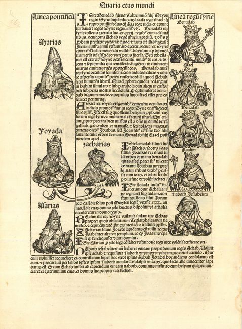 This leaf includes a full-color (9 x 5") illustration of Jericho and an illustration from the history of the third age of the world. The verso is filled with portraits. From a Latin text edition.