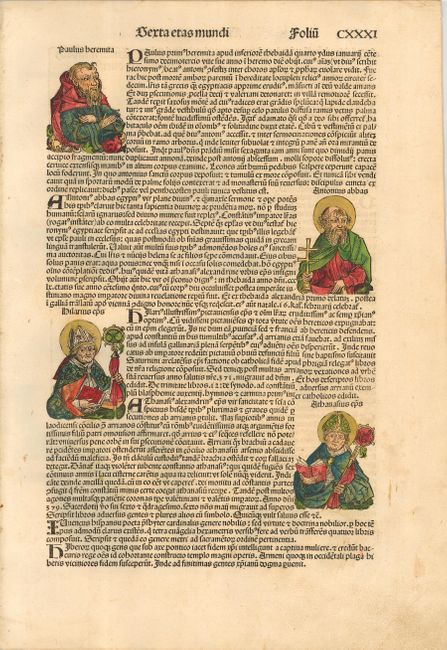 Hartmann Schedel's Nuremberg Chronicle (Liber Chronicarum) was published in two editions, Latin and German, both in 1493, appearing in print just before Christopher Columbus' discoveries completely re-shaped the European view of the World. This splendid work presented the history of the world in a pictorial encyclopedia with approximately 285 pages of text and 1,800 woodcut illustrations. Among these illustrations are views of towns and cities throughout Europe and the Near East. The majority of these views are entirely imaginary. In fact, 49 of the views are actually printed from the same group of 14 woodblocks. There are also 30 double-page views of cities with more realistic images. In addition to the topographical images, there are an enormous number of other subjects, including diagrams of the Creation, comets, family trees, portraits & biblical scenes. The text was compiled and edited by Hartmann Schedel, printed by Anton Koberger, with illustrations designed by Michael Wohlgemuth and Willem Pleydenwurff, who cut the woodblocks, probably with the assistance of their apprentice, Albrecht Durer.