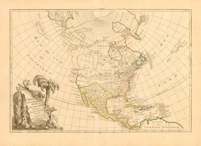 Early edition of this fascinating map that shows the imaginary Sea of the West and a Northwest Passage stretching from Baffin Bay to the Archipel St. Lazare on the Pacific coast. There is not any sign of a recognizable Alaska. The British colonies are confined east of the Appalachian Mountains with French Louisiana stretching to the Pacific Northwest. Florida is controlled by Spain. The large, decorative title cartouche, incorporating a palm tree and grape vines, was engraved by Berthault.