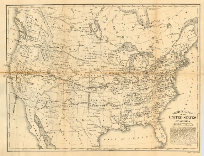 2) Statistical Map of the United States of America. Bowen & Co. Lith., Philadelphia, 1864. Black and white map shows alternate railroad routes to the Pacific, under construction and proposed, the new territorial boundaries (but Wyoming is still part of Dakota) and the Black Hills Gold Region. Wheat calls this primarily a railroad map and provides a full page illustration. (19.8 x 14.8")