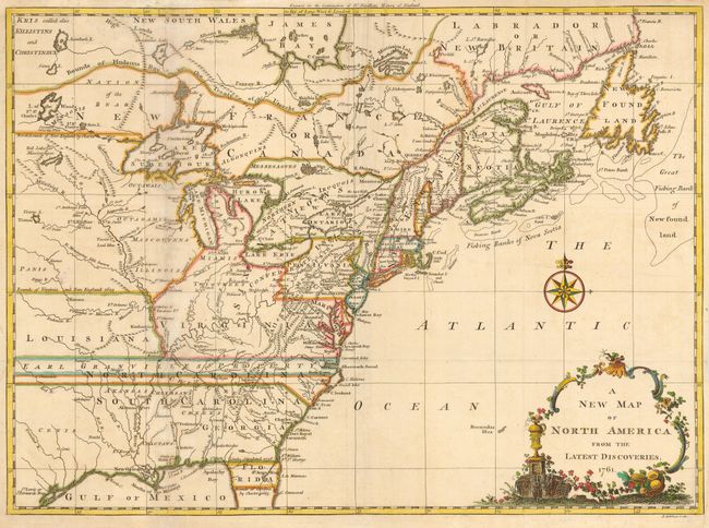 Fine small map showing the colonial possessions in North America east of the Rocky Mountains. Shows early settlements, forts, Indian villages and tribal territory. The colonies are shown with their boundaries extending past the map's western border. Various treaty and charter boundaries are shown. Earl Granville's Property stretches from the Atlantic west to beyond the Mississippi River. In Florida a line from Fort St. George to St. Mark delineates the Limits Stipulated in 1738, and below - nearly to Cape Canaveral are the Bounds of Carolina by Charter of 1665. The fishing banks off Canada are prominently noted. Delicate title cartouche and compass rose. First state.