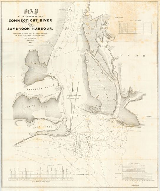 Large map showing nice details of the waters in the vicinity of Saybrook. The coastal features are well defined and the street grid for Saybrook locates numerous buildings along its main street. The famous lighthouse is clearly shown on the western side of the mouth of the Connecticut River. At Griswold's or Eastern Point a single apple tree is drawn and labeled "Leaning Apple tree." Locates Saybrook Point, Lines (Lynde) Point, Great Island, Kelly's Island, numerous sounds, and more. This fine lithographic map is a reduced version of the survey map by J.W. Adams and was made under the direction of Capt. W.H. Swift. Drawn by Washington Hood and M.H. Stansbury. Hood and Stansbury were destined for future fame.