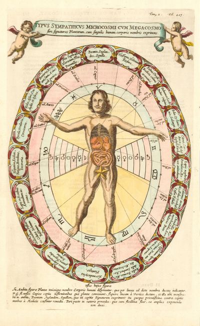 This interesting engraving represents the theory that the human body is the cosmography of the microcosm in correlation to Ptolemy's cosmography of the macrocosm. Thus the workings of the human body are an analogy for the workings of the universe.