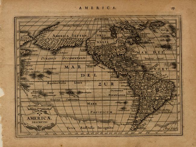 Abraham Goos engraved this fascinating map for Jansson's new Atlas Minor, first published in 1628. The most dominant feature of the map is the curious depiction of the west coast of North America, which is completely bisected by an unnamed straight (Northwest Passage), possibly derived from reports of Juan de Fuca's disputed voyage. The bulging northwest coast of North America continues another 65 degrees and is separated from Asia by a narrow Fretum Anian. These features were derived from the Van den Keere and Plancius globe of 1614 and this is the first time they appear on a map of the Americas. Previous maps had depicted the supposed Northwest Passage through the Strait of Anian. Other interesting features include the St. Lawrence River flowing from a small lake in the West, no Great Lakes and an area of shading in Virginia alluding to the possibility of a Verrazano-type inland sea. German text on verso.
