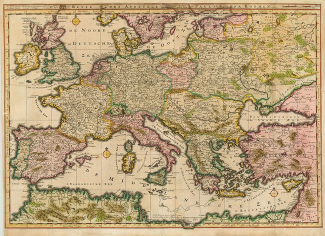 Crisply engraved map of Europe (except Scandinavia) and the Mediterranean, showing the route St. Paul traveled to Rome. Crisply engraved with good detail throughout and decorated with three simple compass roses. The title is in a panel across the top. This is the second state without the engraver's imprint at lower left.