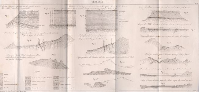 Rarely-seen, first edition of this map by French mining engineer M. P. Laur of the Gold Regions in California. The map shows the state from Crescent City to St Luis Obispo. The Gold Regions are printed in red hachure. The cartography seems to come from a couple different sources, but is based primarily on Fremont's map of the region. Map bound and folded into paper backed report Annales Des Mines ou Recueil, dated 1863, which also includes an early photograph of a miner and three geologic sketches. Not in Wheat or Library of Congress. Octavo, 112 pp plus 4 folding illustrations and 1 folding map.
