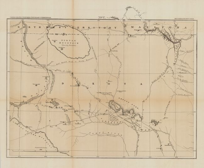 This map is number five from a series of six maps and one profile view printed by the United States Northern Boundary Commission. The maps were part of the process of separating out the territories of Montana, Dakota and Minnesota from each other and Canada. The boundaries were marked with mounds and iron pillars that were spaced one mile apart. This map shows trails reconnoitered by parties of the Boundary Commission, as well as wagon roads, forts and Indian reservations. Among the routes marked are those of Capt. W.J. Twining (1869/1873), Lt. F.V. Greene (1873/74), C.L. Doolittle (1874) and the Half Breed Road to Woody Mountain. This map is roughly centered on Devil's Lake and shows a bit of the Couteau du Missouri and portions of the James and Cheyenne Rivers. Many interesting features located including Turtle Mountain and Ft. Totten.