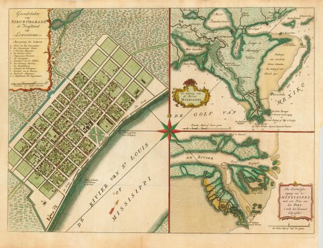This handsome sheet consists of three maps composed around a large compass rose. This is Tirion's version of the map first drawn by De la Tour in 1720, only two years after the founding of New Orleans. The first is a plan of the city of New Orleans (now the French Quarter) vividly depicting its protective canal, barracks and quays. The second is a map of the vicinity of New Orleans including the delta and surrounding bayou. The third is a map of the location of Fort la Balisle at the mouth of the river, which sank into the marsh in the late 1700's. Each map has a delicately engraved title cartouche.