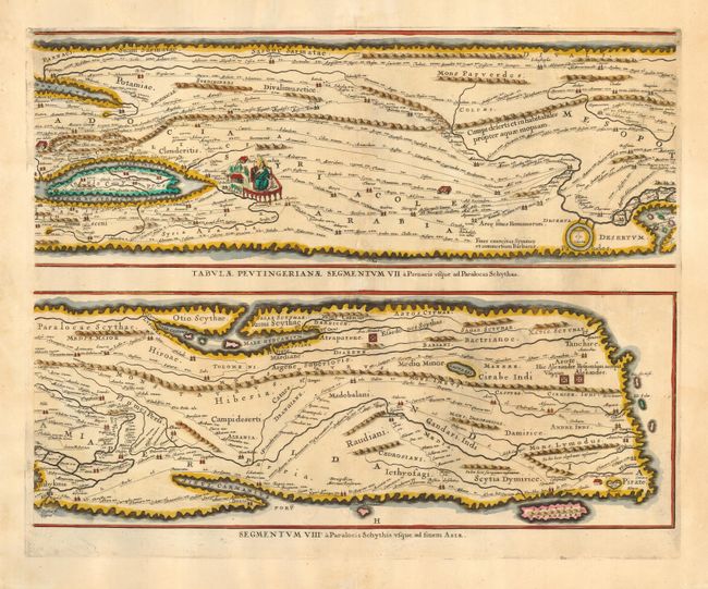 Four sheets making up the famous Peutinger Table, or a Roman road map of the world. In a sequence of four plates, each with two strip maps, the chart depicts the imperial roads and posts within the Roman Empire throughout Europe, North Africa and Asia as far as Toprobana (Sri Lanka). These maps, based on the original manuscript, were first popularized by Ortelius in 1598 and became an important part of his great historical atlas. Jansson's version is nearly identical to that of Ortelius. The original parchment document came into the hands of Konrad Peutinger resulting in the common name for the chart. Blank on verso. Size given is for each plate.