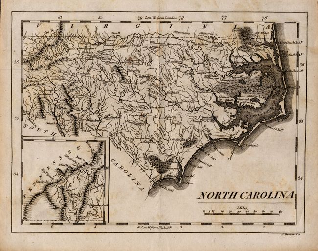 This is a well engraved copper plate map that details towns and villages, watershed, topography, and the extensive wagon road system of the day. At lower left is an inset map of the western portion of the state of Tennessee. Longitude is shown from London and Philadelphia. Boldly engraved by J. Bower.