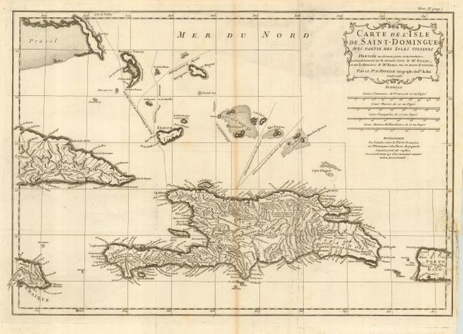 A fine copper plate engraving of the island shows topography, locations of numerous towns and other details. Scope includes the Turks and Caicos Islands, with parts of Jamaica, Puerto Rico, Cuba and the Bahamas, all of Haiti and the Dominican Republic. Samana is shown as a French-controlled island, and text in the center of Santo Domingo notes that gold, silver, and copper mines are in this region. Filled with place names and details of mountains and watershed. Rococo-style title cartouche with four distance scales below.