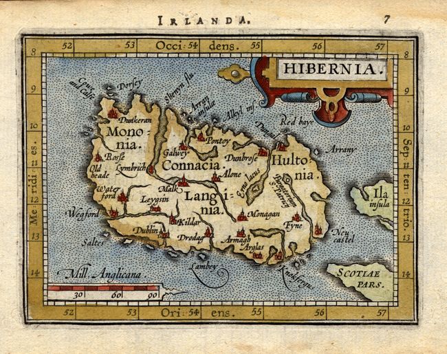 Fine miniature map of Ireland with major cities, rivers and lakes named. North is oriented to the right of the map and it is adorned with a strapwork title cartouche and simple scale of miles. The map was engraved by the brothers Ambrose and Ferdinand Arsenius who had been assistants to Frans Hogenburg and co-engravers of Ortelius' folio Theatrum. Italian text on verso.