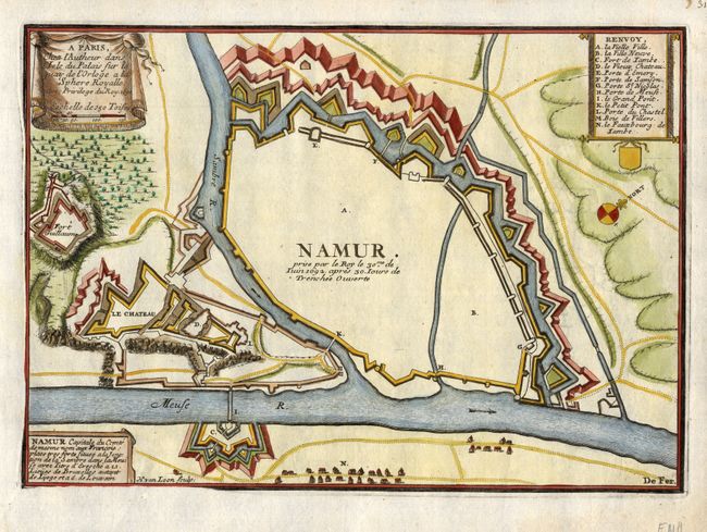 Fine plan that illustrates the fortifications of Namur and is oriented with northwest at top. The plan is embellished with two cartouches and includes a key showing thirteen important locations. Engraved by Herman van Loon. Nicolas de Fer held the title of Geographer at Louis XIV's court. He was one of the most prolific publishers of plans of European cities in the late seventeenth century.