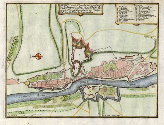 This fine plan illustrates the fortifications of Dinant on the Meuse River. It is oriented with north at the left by a small compass rose. The plan includes a key showing 23 important locations. Engraved by Herman van Loon.