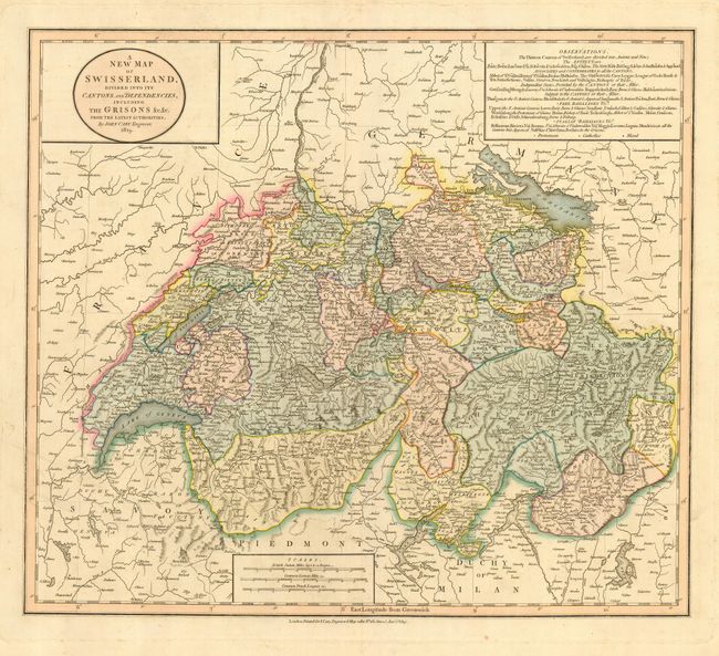 This is a very handsome and detailed map of Switzerland showing much information of the towns, cities and topography. The area shown includes the Rhine River at the top of the map and Lake Constance on the border of Germany and Lakes Geneva and Maggiore on the border of Italy.