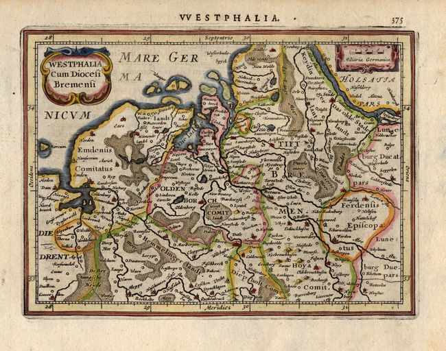 This small map centers on Bremen and shows the waterways of northern Germany in careful detail. The map reaches from Emden in the west to the Elbe river in the east. To the far east is the duchy of Luneburg. Adorned with a strapwork title cartouche and scale of miles. Latin text on verso.