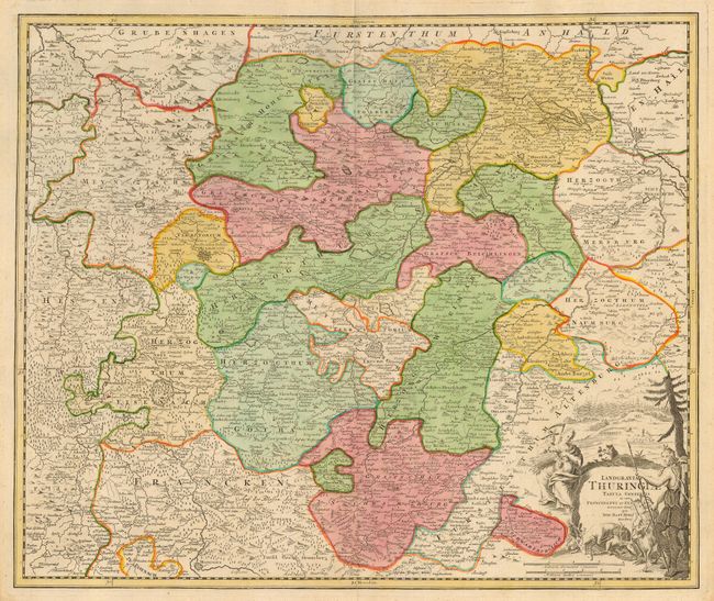 This is a handsome map of east central Germany, centering on Erfurt. Mountains and forests are pictorially depicted throughout. Bucolic harvest setting and Diana, the hunter, adorn the title cartouche.