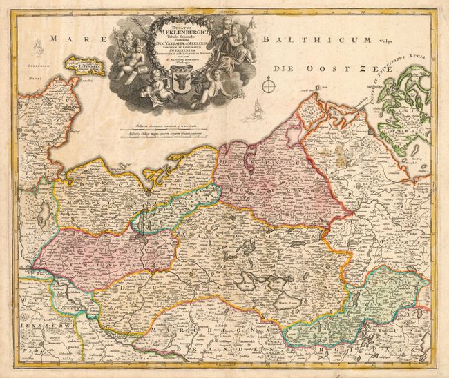 Bold, decorative map covers the region from Holstein and Lubeck in the west to Rugia and Pomerania in the east. The principal cities include Lubeck, Schwerin, Rostock, Gustrow, Stralsund and Waren. Several chubby putti surround the large title cartouche with the coat of arms.