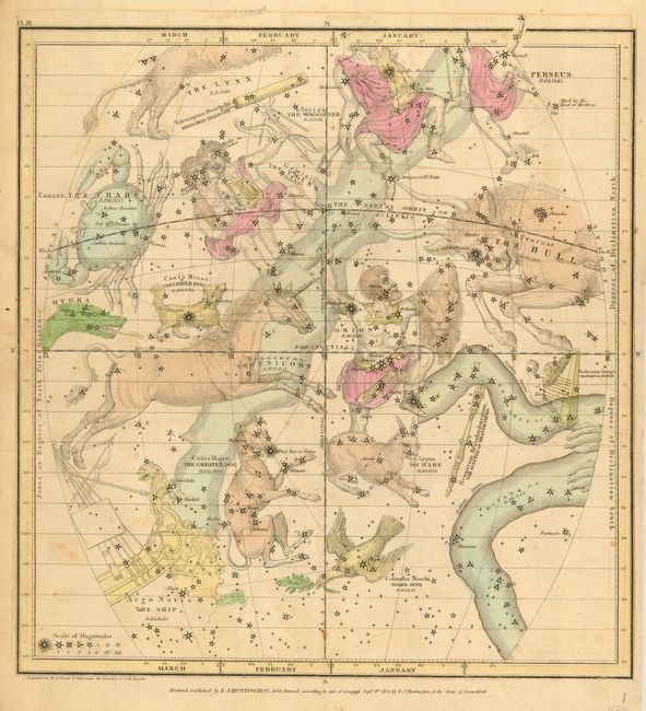 Four celestial charts showing the constellations during the months of January, February, March / April, May, June / July, August, September / October, November, December. Shows Orion, Taurus, Cancer, Perseus, Monoceros, Hydra, Bootes, Ursa Major, Leo, the Centaur, Corona Australis, Capricornus, Scorpio, Libra, Hercules, and many more. Each is finely engraved with original hand coloring. Stars are shown by their magnitude between 1 and 6, plus star clusters and nebula. Beside the stars and constellations, the Milky Way is prominently shown. Covers the sky from 50° North to South Declination. Matching set of four.
