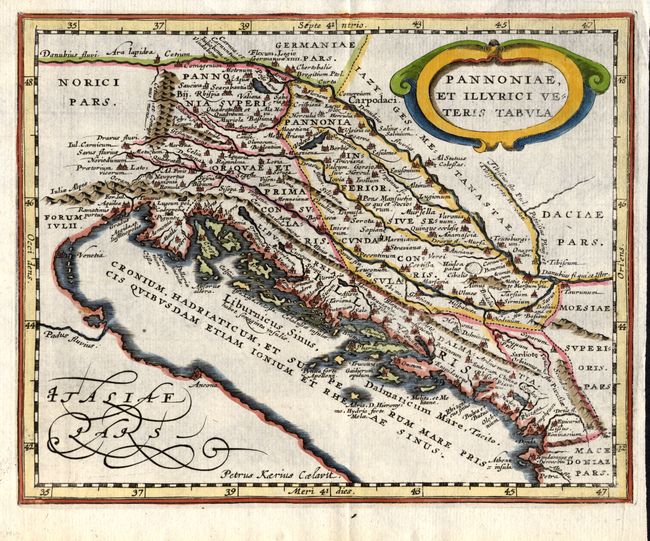 Attractive historical map of the Dalmatian coast from Italy to Greece. The map is based on Ortelius' map of the same title, which was based on Gastaldi's map of South East Europe (1560) and other information from ancient sources. Decorated with a strapwork title cartouche. Engraved by Petrus Kaerius.