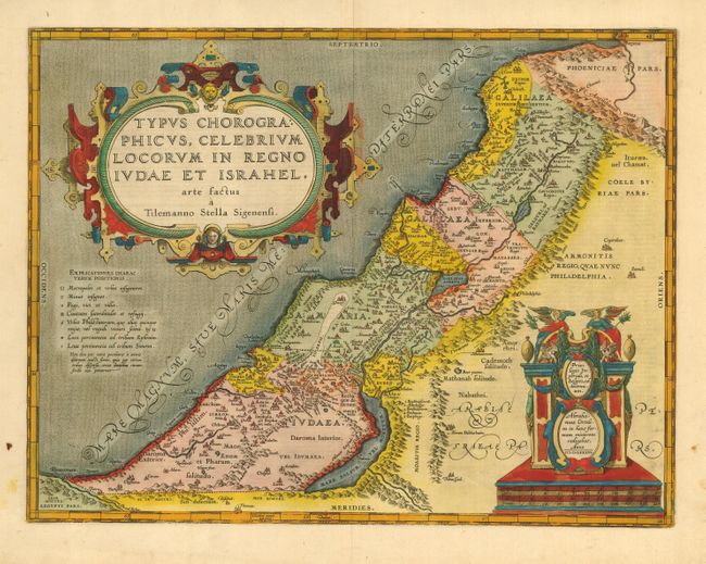 This is a superb map of the ancient kingdoms of Judea and Israel based on Tilleman Stella's maps of 1552 and 1557. This is a fine example of Ortelius' engraving style with two extraordinary cartouches. A key identifies major cities, priestly and sanctuary towns, Philistine cities, and places belonging to the tribes of Ephraim and Simeon. The map is dated 1586 but was not published until 1590. German text on verso.