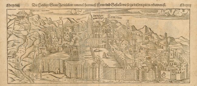 Bold woodcut view of Jerusalem from an edition of Munster's Cosmographia. The well-detailed view as depicted from outside the walls with numerous buildings and temples named. On a full sheet of German text with text on verso.
