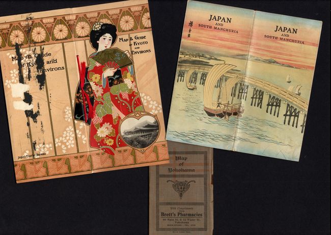1) Map of Yokohama, circa 1915. Brightly colored map advertising "Brett's Pharmacy… the largest foreign-staffed dispensary in Japan" with inset map of the vicinity of Yokohama and an index to consulates and important places. Folds into printed wrappers "With compliments of Brett's Pharmacies." (18 x12.6") This interesting map is currently offered by a dealer of rare oriental books for over $400.