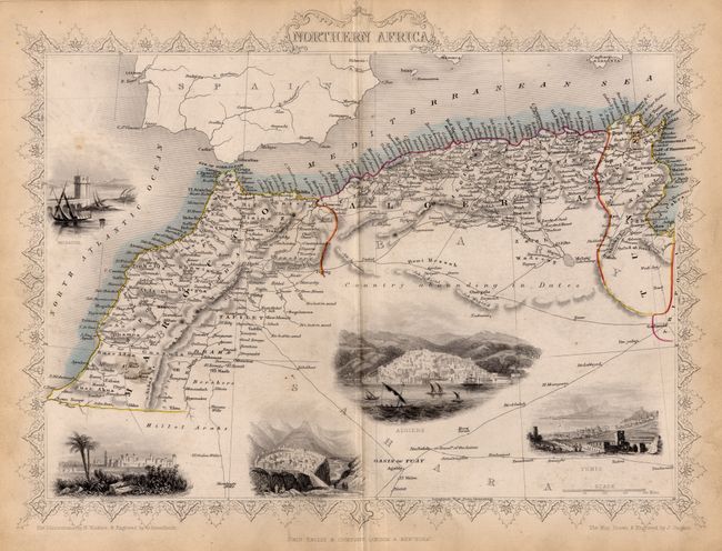 Good detail of the areas with the beautiful border associated with this series of maps. Drawn and engraved by John Rapkin. Northern Africa includes vignettes of a Mogador, Morocco, Constantine, Algiers and Tunis and depicts many caravan routes. Western Africa extends from Senegal to the Bight of Biafra and has vignettes of Christiansborg, Cape Coast Castle, Bakel, and Sierra Leone. Liberia had just become a free country in 1847, and is here named. The coast also shows the names of theSlave Coast, Grain Coast and Windy Coast in addition to the Ivory and Gold Coasts.