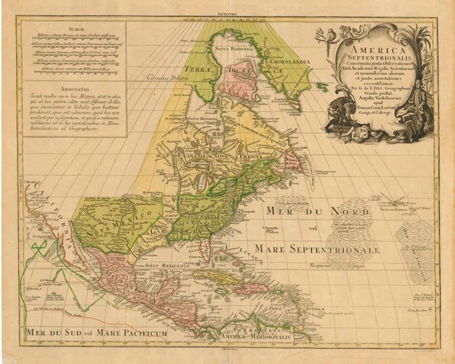 This is Lotter's version of Guillaume Delisle's foundation map of North America (1700). The Great Lakes are based on the Coronelli model showing the French strong points at Tadousac, Quebec, Fort Sorel, Montreal and Fort Frontenac. The English settlements are confined east of the Mississippi and Illinois Rivers and include all the land around both lakes Erie and Ontario. French Louisiana is comprised of a narrow strip between the Mississippi and New Mexico, but stretches south to include most of present-day Texas. Numerous tracks in the Pacific show the routes of different voyages. The most interesting aspect of the map is the region of California. Delisle was the first cartographer to revert to a peninsula form for California. Lotter follows that here, but engraved the map in such a way as to leave the possibility still open for the island theory. The large cartouche features a Native American and a ship's captain.