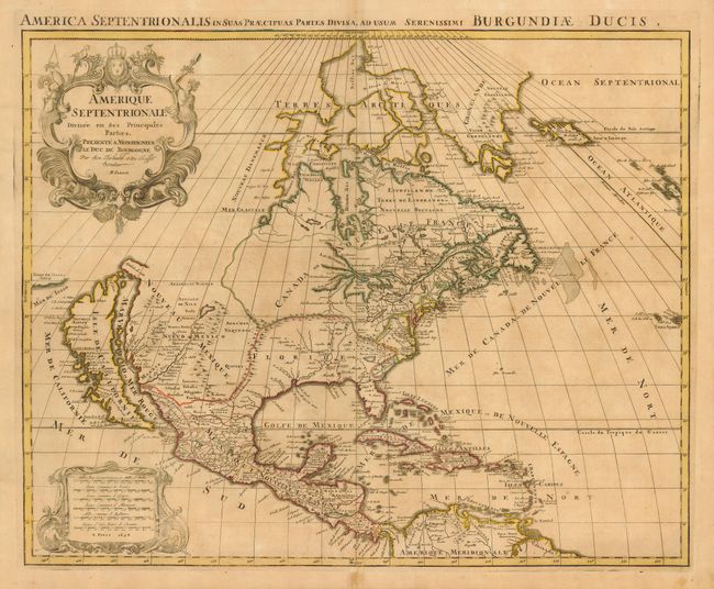 First state of this handsome map showing the island of California with an indented northern coast and the Terre de Iesso Ieco (Japan) just a short distance off its northwestern coast. All five Great Lakes are now shown, with Superior and Michigan open-ended. The Rio del Norte flows incorrectly into the Gulf of California. The lion's share of today's United States is divided between Floride and Nouveau Mexique. The region of present-day South Carolina and Georgia is noted as Floride Francois. The decorative title cartouche is adorned with the French coat of arms, two Native Americans and tropical birds at upper left, with the distance scale cartouche on below. The Latin title in upper margin is, "America septentrionalis in suas praecipuas partes divisa, ad usum serenissimi Burgundiae Ducis." Jaillot published a similar map with the same title that is much more commonly found on the market.