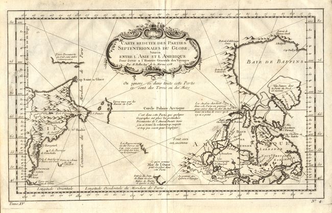 Very unusual chart that shows only the northeast coastline of Canada with Baffin and Hudson Bay and the St. Laurence River. On the other side is the northeast coastline of Asia with the Kamchatka peninsula. In between are a few small areas of coastline with notations concerning reported explorations, including those of Juan de Fuca, the Russian expeditions in 1728 and 1741, the reported Sea of the West and the English quests for a Northwest Passage via the Hudson Bay.