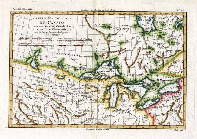 A nice example of one of the most interesting maps of the Great Lakes that depicts frontier forts, missions, and fur trade routes. It covers the region from James Bay to just below Ft. Duquesne and from Lake Ontario through the Great Plains. It contains numerous Indian tribe names and forts including Detroit, St. Louis, Toronto and Chicagou. Lake Superior contains Isle Royale, as well as the phantom islands of St. Anne, Maurepas and Ponchartrain, which were reported by the Jesuit explorer Charlevoix. The Keweenaw Peninsula is noted as Pt. de Kiaonan. The source of the Mississippi is noted as inconnu or unknown. First state, engraved by Andre.