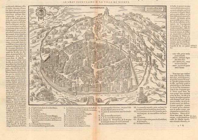 This rare plan of the city of Nimes was designed by Edouard Bredin for the French edition of the Cosmography. The plan is flanked by columns of French text and a key at bottom locates the important buildings. French text on verso.