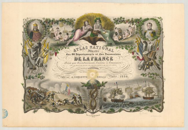Attractive title page from one of the last decorative atlases of the nineteenth century. The steel engraved scenes surrounding the script title are enclosed in a border of tree branches and grapevines engraved by Eugene Duchez. The page is filled with infantry and naval battle scenes, portraits of Charlemagne and Napoleon, armor and weaponry, ballooning, an early railroad engine, a river god and goddess and a group of cherubs engaged in a variety of scientific and artistic pursuits.