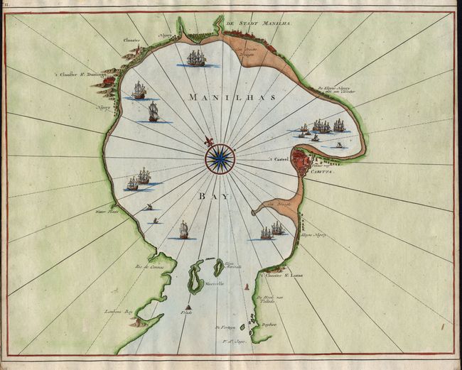 This is a great chart of Manila Bay from Valentyn's encyclopedic illustrated account of the Dutch trading Empire in Asia. The map shows the city of Manila, the fortress Cabitta and several missions. The map is centered on a bold compass rose and embellished with several sailing ships. Valentyn was an important Dutch historian, who traveled to the East Indies twice. He was granted access to the secret archives of the Dutch East India Company in preparation for his account of the Dutch voyages to the Indies.