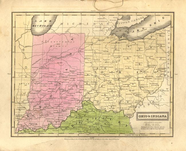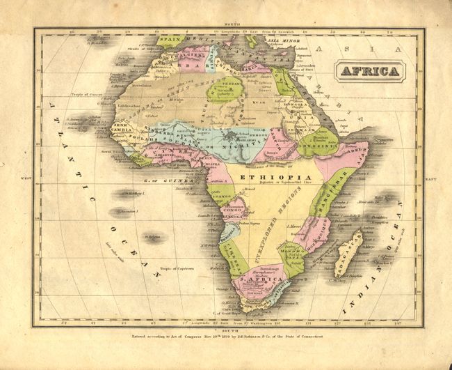 This is a complete example of Olneys' atlas with eleven well engraved and hand colored maps. This early edtion inlcudes these maps: world in hemispheres (dp), world with thematic chart of religions, North America, United States, Eastern States, Middle States and part of Southern States, Ohio and Indiana, South America, Europe, Asia, and Africa. The cartography in the United States shows Wisconsin Territory between Lake Michigan and the Missouri River. The large Missouri Territory extends from the Missouri River to Oregon Territory and south to include Indian Territory. The area of today's Oklahoma is part of Arkansas Territory. On the North American and United States maps the boundary in the Northwest extends well into British America per the "Boundary determined in 1824." A thematic chart shows the comparative size, population and forms of government with four engraved vignettes; Indian Village, Morocco, Constantinople and New York. Printed paper covers that double as the title page and list of maps. Published by D.F. Robinson & Co.