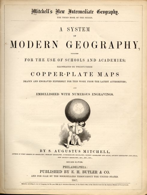 Samuel Augustus Mitchell's school atlases and geography were published from the 1830s until the 1880s and were among the more commercially successful atlases of their time. Complete with twenty-two full page hand-colored copperplate maps, including Map of the United States, and Map of the British Provinces. A very nicely illustrated example with engraved vignettes, diagrams and statistics. Hardbound, title page, Advertisement, Preface, Contents, index, 110pp.