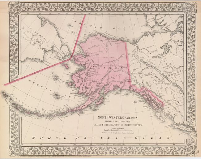 This interesting map of Alaska depicts the territory purchased from Russia, known as Seward's Folly. It shows Alaska with no organized areas and the interior virtually blank, save for the occasional river and Fort Yukon. Just a few villages are named and there is no sign of Mt. McKinley. Sitka is here called New Archangel. This is one of the first atlas maps of Alaska Territory. With Mitchell's decorative grapevine border.