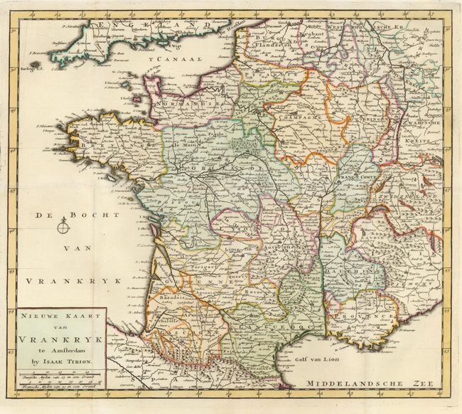 A very attractive map of France filled with quite a bit of information on the regions, cities, towns and topography, including a portion of England's southern coastline. A simple compass rose graces the sea.