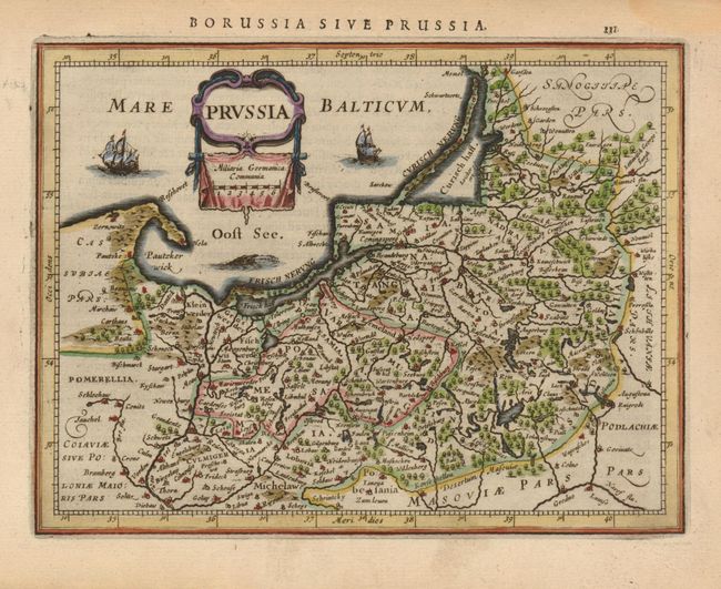 Delightful small map depicting present-day Poland and Lithuania. The map is fully engraved with rivers, lakes, forests and mountains and is filled with place names. The Baltic Sea is filled with an ornate title cartouche, sailing ships and a sea monster.
