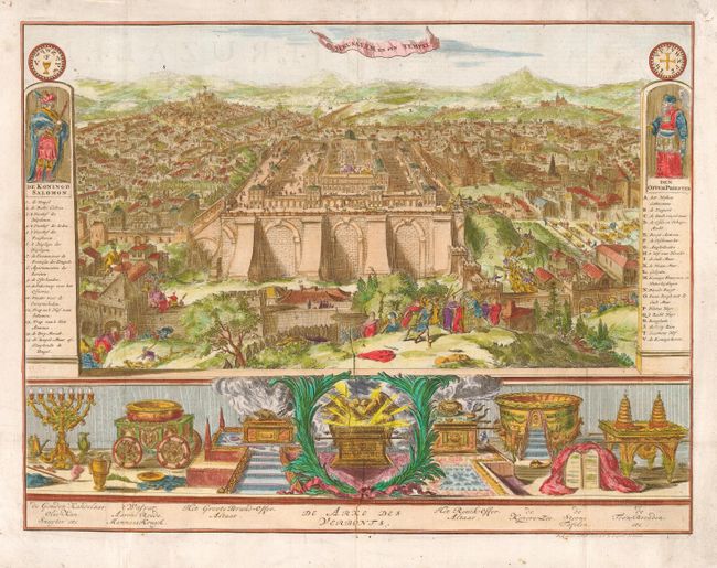 Panoramic view depicting the layout of the city surrounding the temple and filled with people, soldiers, livestock and a scene of Judas embracing Jesus and signaling his arrest by the Romans. Panels at the sides name the important buildings and include two full-length portraits of Aaron and King Solomon. Across the bottom are large engravings of the Vessels of the Temple. This is the second state exhibiting cracks in the center of the plate. Dutch text on verso.
