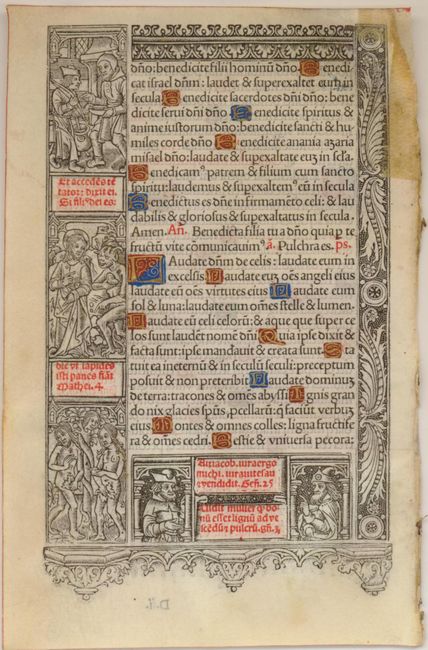 This Book of Hours leaf was printed by Thielman Kerver in 1507 on vellum in black and red, with many initials hand painted in red, blue and gold. Around the text are iron engravings depicting scenes from the Old and New Testament, with captions in red. These pictures explained the relationship between the Old Testament and the Life of Christ, with images of Moses, Adam and Eve, the Baptism of Christ and the Temptation of Christ. Decorative ornamental borders further enhance the page. The text is a passage from Psalms.