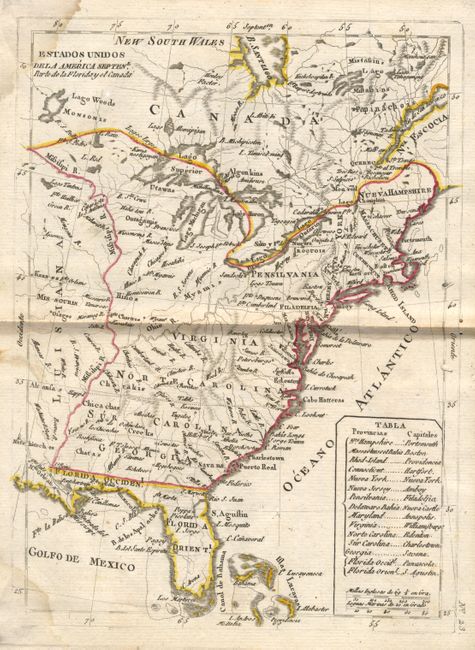 This is a scarce Spanish atlas by Lopez de Vargas Machuca (1730-1802), Geographer to the King of Spain. It is complete with 22 double page and 5 fold out copper engraved maps, all but the first two with original outline color. The maps include two celestial; one world, 12 European; three Asian; three African; four American (North America, United States, Caribbean, South America), ancient Israel; and ancient Mediterranean. The fascinating map of North America depicts the entire northwest coast as a mostly straight line with no hint of Alaska. The Northwest Passage is evident with a complicated river and lake system flowing to the Pacific. At right is a table listing the states and territories of Spain and the United States. A simple but elegant, engraved title page graces the front of the atlas and is followed by 24 pages of text and the 27 maps. 8vo. Original hardbound in full calf with gilt title on spine and marbled endpapers inside.