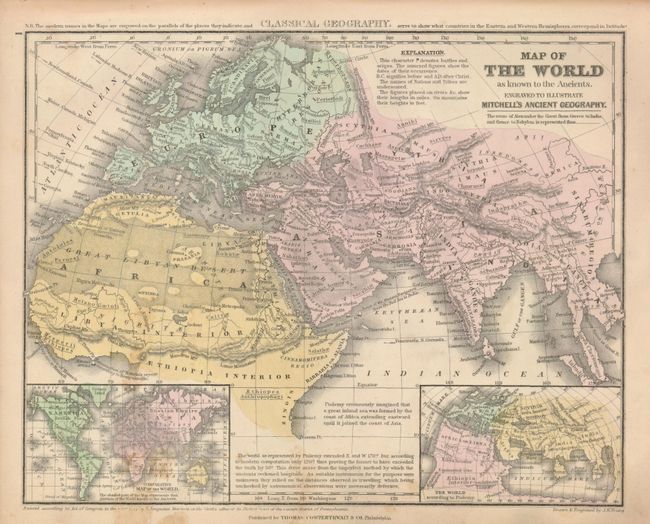 2) Mitchell's Ancient Atlas, Classical and Sacred…, Cowperthwait, Desilver, & Butler, Philadelphia, 1854. A wonderful geography describing the ancient world. The complete atlas has its title page, and an eleven-page index followed by twelve hand colored, copper engraved maps with Europe being the lone double-paged example. 4to (10 x 12.5"), hardbound in original brown paper covered boards with cloth spine. Text and maps generally good with light soil and a few spots of foxing. Covers are shelf worn and scuffed with some loss at the extremities. Binding is loose.