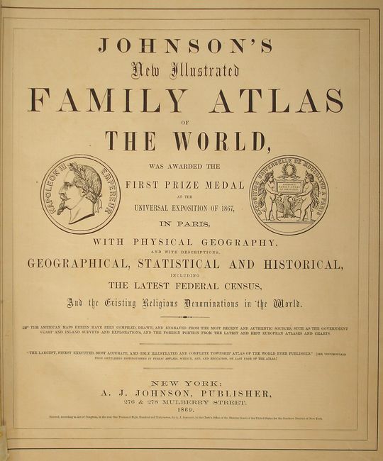 Large folio atlas with all maps and text present including a lovely, steel engraved frontispiece of the U.S. Capitol. This is a less common later edition with the newly engraved maps featuring a lace-like border. Contains three colorful thematic maps and charts including an uncommon length of rivers and height of mountains chart, and a great double-page "New Chart of National Emblems," and a very colorful set of national flags. Also contains the Civil War "Map of the Vicinity of Richmond and Peninsular Campaign in Virginia," a nice double-page map of Texas and the large "California, also Utah, Nevada, Colorado, New Mexico and Arizona" map. With all called-for maps in the list including 42 double-page and 19 single-page sheets. Hardbound in cloth with embossed gilt on cover and spine.