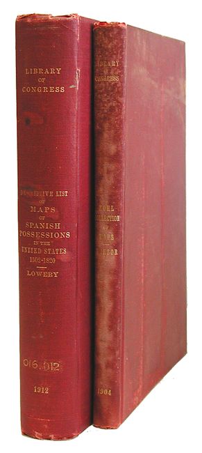 1) A Descriptive List of Maps of the Spanish Possessions…1502-1820, Woodbury Lowery, Washington, 1912. This important carto-bibliography is an annotated record of approximately 700 maps important in the history of the Spanish colonies in North America. It has extensive references to source materials as well as a comprehensive index. A portrait of Mr. Lowery is on frontis, and a lovely, full color decorative title page grace the front. 8vo, hardbound in red cloth with gilt title on spine. Contents are very good with only the frontis and title page toned and lightly foxed. Covers are shelf worn and front hinge has a small separation. Binding tight. Ex-libris, with withdrawn stamp on front end-paper.
