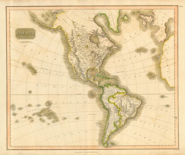 In Thomson's style, this well engraved map shows the latest discoveries including those of Mackenzie, Hearne, and Lewis & Clark. It is a detailed copper engraved map that includes numerous place names, watershed and topography. Names Indian tribes including the Snake, Blackfoot, Chipaways, and many more. The map extends to include the coasts of Europe and West Africa, and it presents good detail of islands in the eastern portion of the South Pacific. The United States is shown north of East and West Florida, and east of the Mississippi River. The land west of the Mississippi is called Louisiana. The Rocky Mountains meander across the continent from northern Canada to Panama. Hawaii is here called the Sandwich Islands.