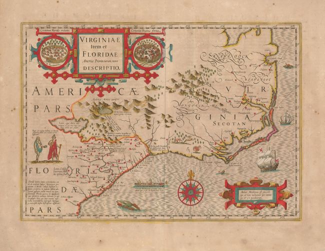 Superb map compiled from John White's Virginia and Jacques le Moyne's Florida as interpreted by Theodore de Bry. Largely due to the enormous success of this atlas, Le Moyne's erroneous depiction of a large inland lake from which the R. de May (St. John's River) flows in a southeasterly direction was popularized. Chesapeake Bay, here called Chesepioock Sinus, and the area south towards C.S. Romano Hispanis are shown in their White delineation. The Indian villages of Paquiwok, Croatoan, and Wococon are named in the Outer Banks and several others are delineated along the present-day Albemarle and Pamlico Sounds. The map is extensively decorated with depictions of Indian villages incorporated in the strapwork title cartouche, a Floridian king and queen, and Virginian natives in a canoe taken from De Bry, wildlife including a wild turkey, ships, sea monsters and a superb compass rose. French text on verso.
