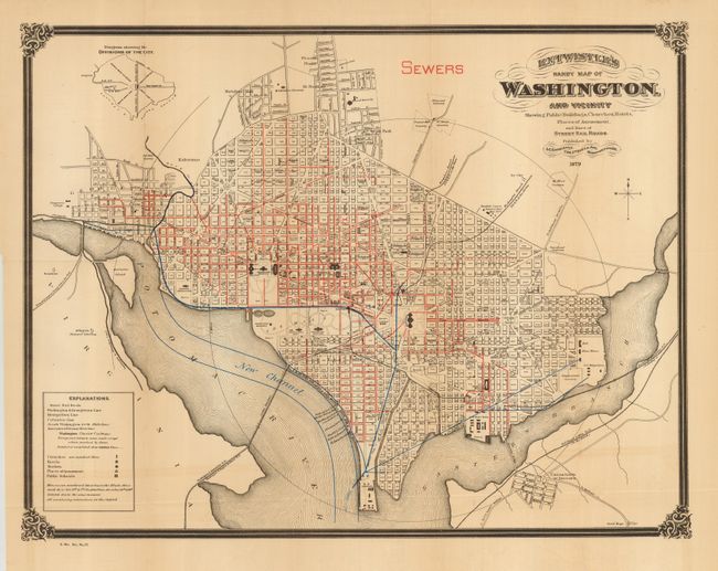 This is a great map of the capital with all streets, railroads, bridges, buildings and monuments located and named. It shows part of Uniontown (or Anacostia), the Arlington National Cemetery, Georgetown College, and more. All surrounded by a bold border with decorative corner elements. The subject of the map is the sewage system, which is shown in full detail via red overprinting. One is tempted to suggest this is possibly the most overworked sewage system on earth.